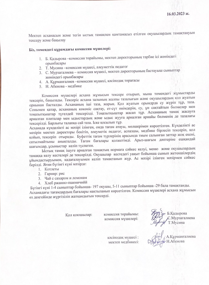 Мектеп асханасын және тегін ыстық тамақпен қамтамасыз етілген окушылардың тамақтануын тексеру және бақылау