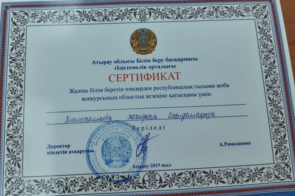 Республикалық ғылыми жоба конкурсының облыстық кезеңіне қатысқан Хисметоллаева Жанеркем сертификатпен марапатталды.
