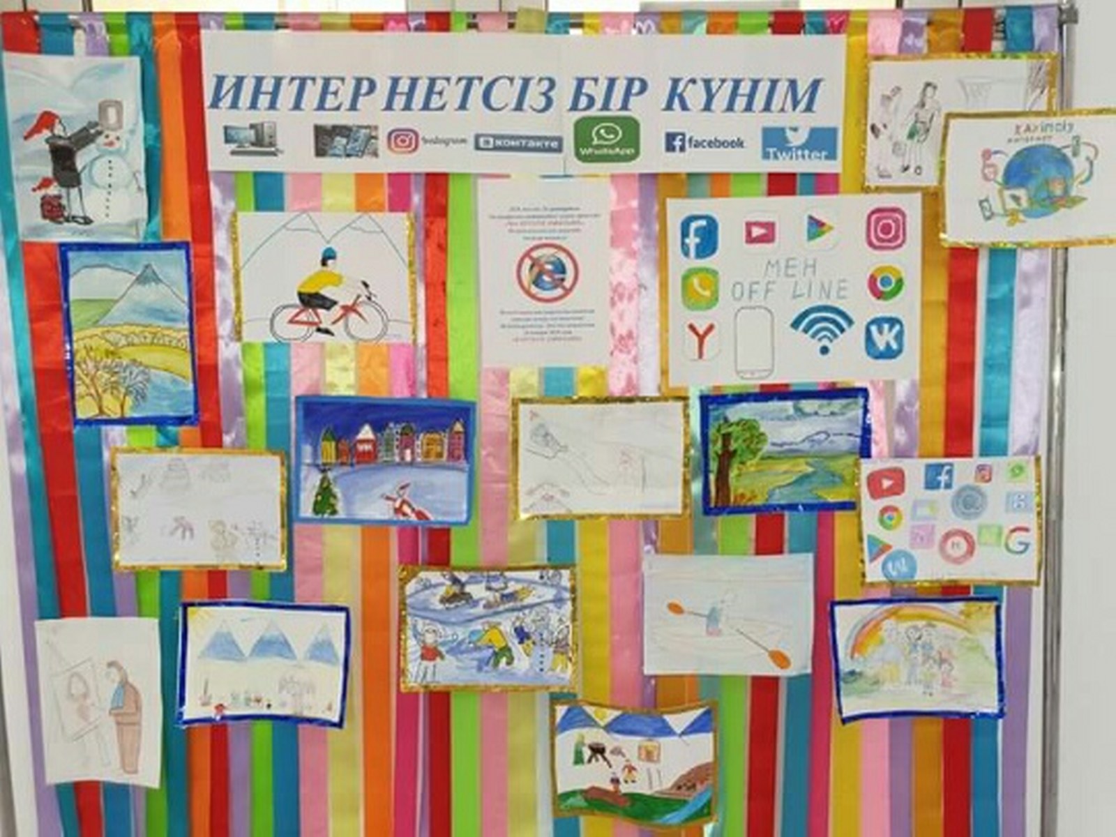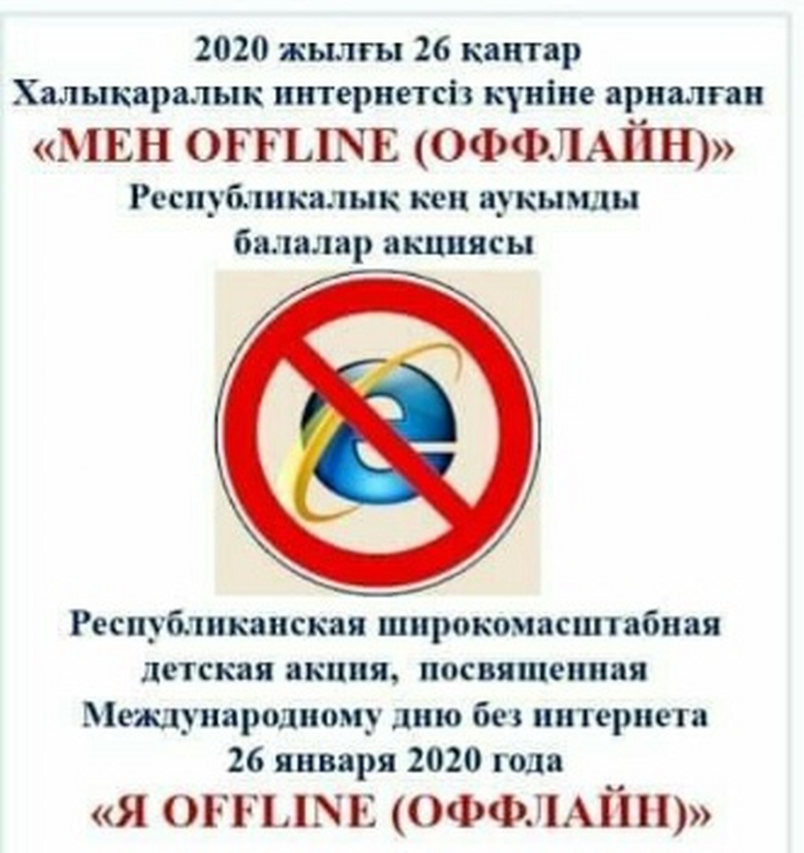 Мектебімізде Халықаралық интернетсіз бір күн акциясы жүргізілді . Акцияның мақсаты: Оқушылардың денсаулығына зиян келтіретін ақпараттардан, насихат пен үгіттің теріс ықпалынан қорғауға атсалысу. 1-4 сынып оқушыларына" Менің интернетсіз бір күнім " тақырыбында сурет байқауы, тəрбиелік шаралар, 5-11 сыныптарға " Мен " OFFLINE " эссе байқауы өткізілді. Мектеп оқушылары шараларға өз белсенділіктерін көрсете білді.
