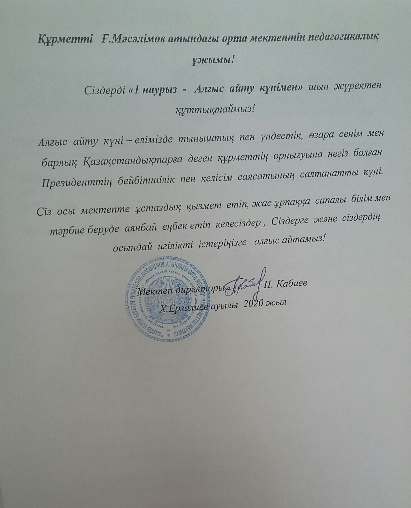 Мектебіміздің директоры Қабиев Парух Ғатауұлы "1-наурыз- Алғыс айту" күніне орай өзінің тілегін білдірді.
