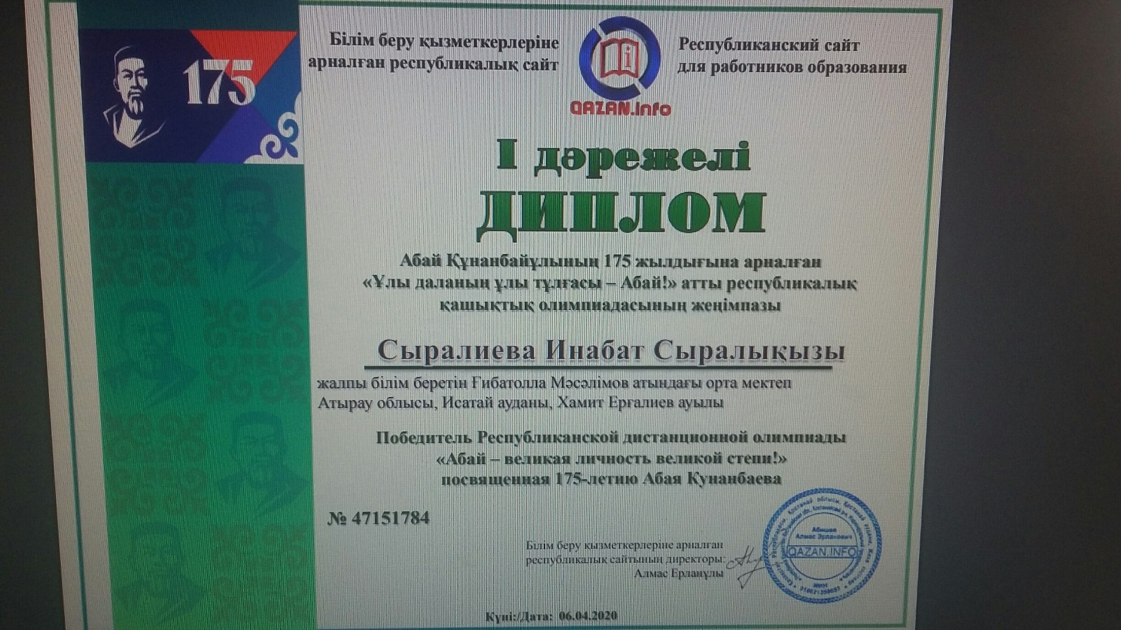 Мектебіміздің жас маманы, қазақ тілі мен əдебиеті пəні мұғалімі Сыралиева Инабат Сыралықызы Ұлы Абайдың 175жылдығына орай өткізілген "Ұлы даланың ұлы тұлғасы-Абай " атты республикалық қашықтық олимпиадасына қатынасып, қатысқаны үшін сертификатпен, І дəрежелі дипломмен марапатталды! Мектеп ұжымы атынан құттықтаймыз! ?