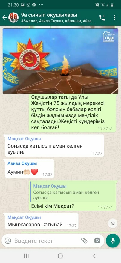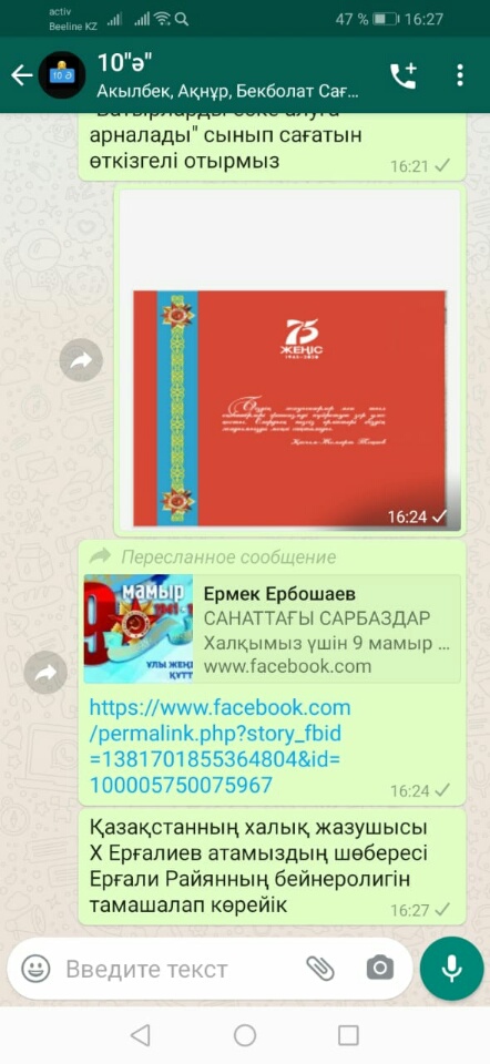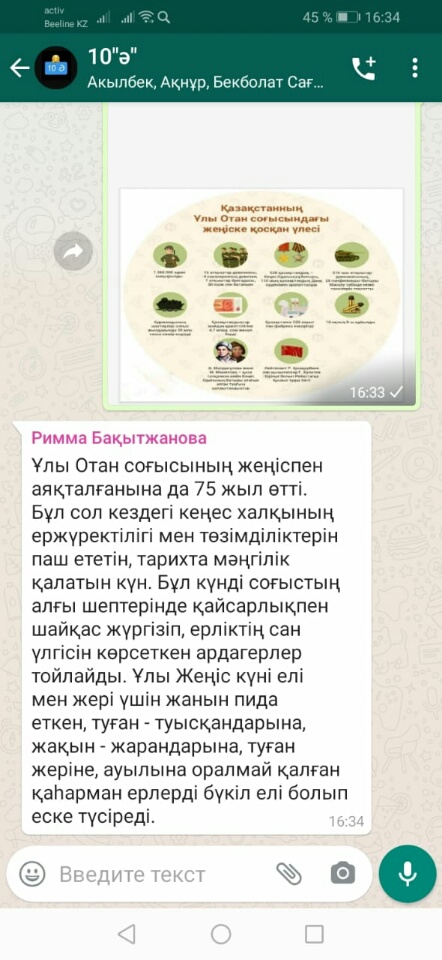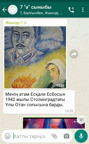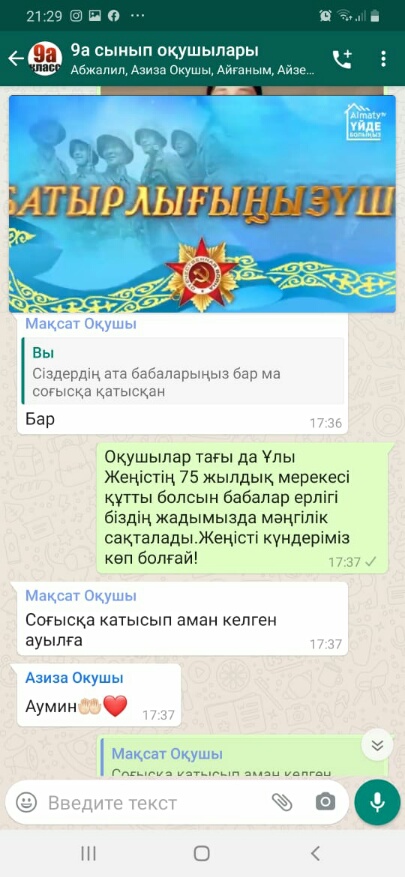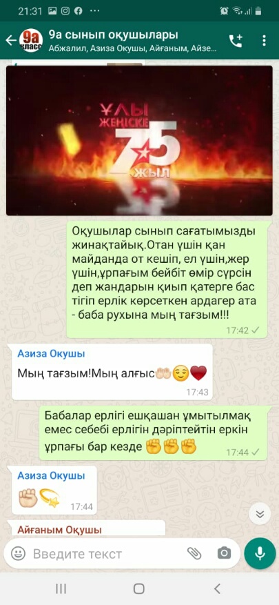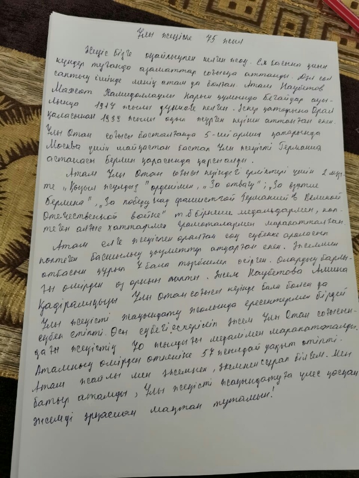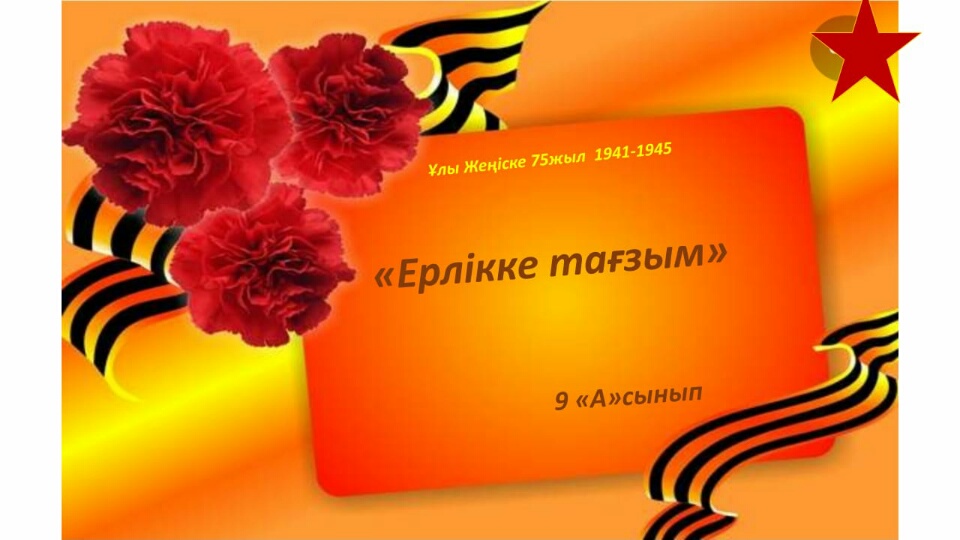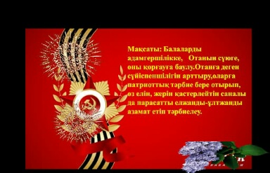 Жалпы білім беретін мектептерде Ұлы Жеңістің 75 жылдығына орай "Батырларды еске алуға арналады" тақырыбында өткізілген шаралар. Мақсаты : соғыс кезеңдері туралы мағлұмат беру, осы соғыста құрбан болған ата-əжелеріміздің мəңгі жас болып, жадымызда сақталған жауынгерлер рухына, бейбіт кезеңде дүниеден өткен ардагерлер аруағына, бүгінде ортамызда жүрген Ұлы Отан соғысының ардагерлерін құрметтеуге, Отансүйгіштікке, елжанды патриоттық сезімге тəрбиелеу.