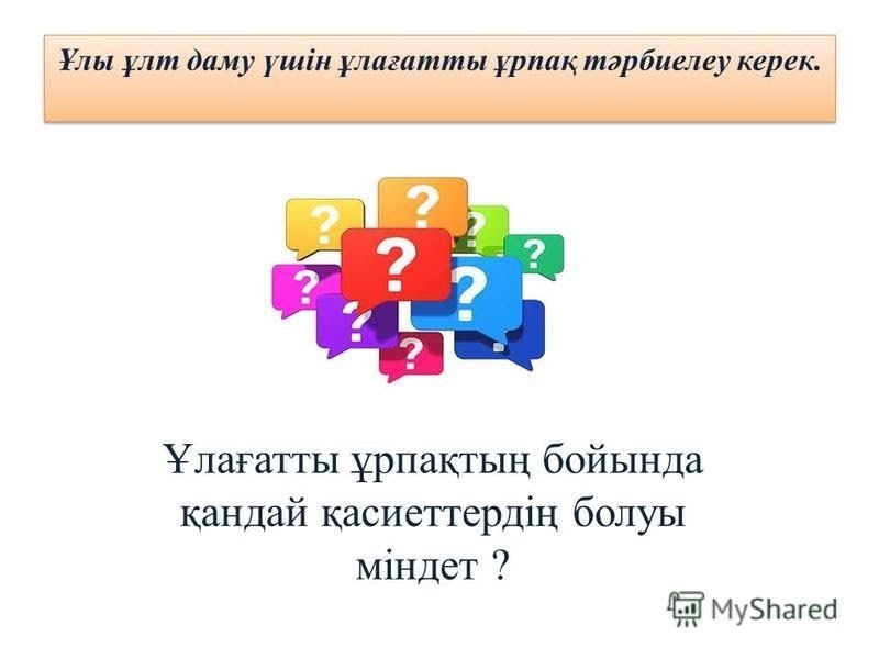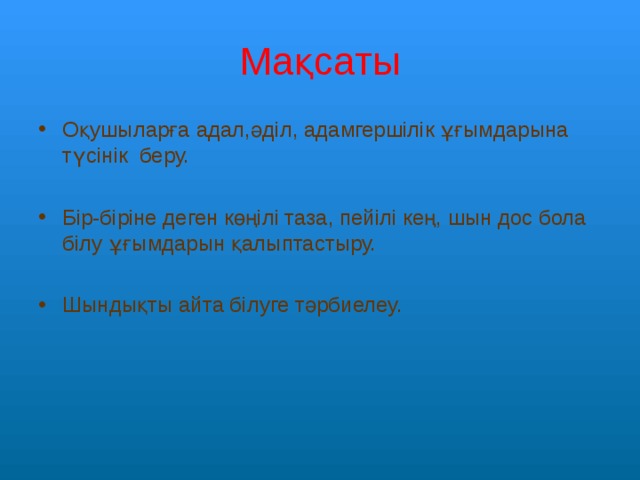 Оқушылардың бойына рухани адамгершілік қасиеттерді ұялату үшін мейірбан, ақылды, шыншыл, қайырымды т. б адамдық асыл қасиеттерді игеруге ықпал ету. Бірін - бірі сыйлап, мейіріммен қарауға тәрбиелеу.