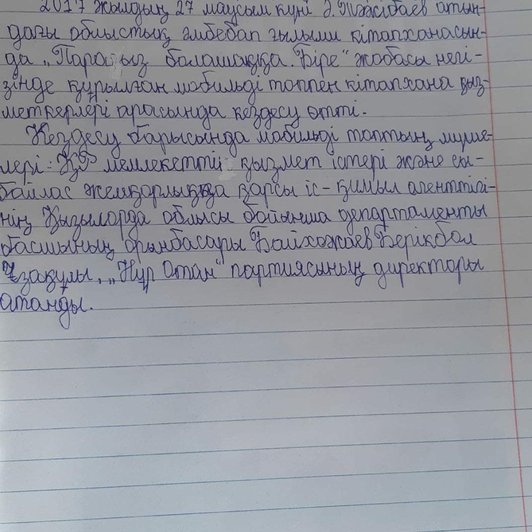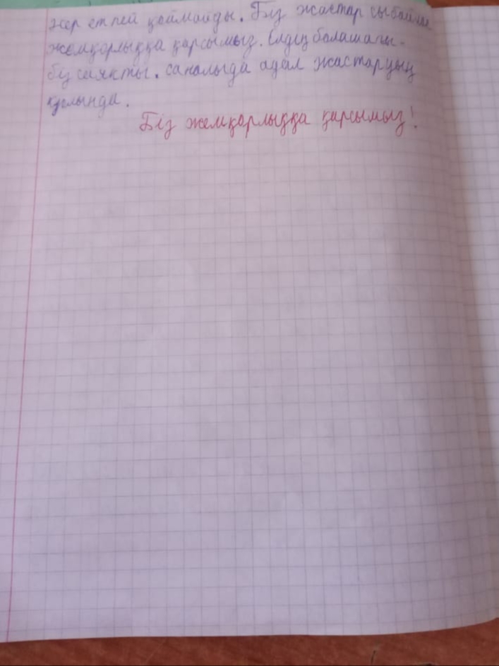 Елімізде болып жатқан эпидемиологиялық ахуалға байланысты оқушыларымызға қашықтықтан оқыту жағдайында "Сыбайлас жемқорлықсыз ел- өркендеуші ел" тақырыбында онлайн эссе байқауы өткізілді. Мақсаты:Оқушылардың бойына сыбайлас жемқорлыққа қарсы тұрарлық мәдениетін қалыптастыру, дүниетанымдарын кеңейту.
