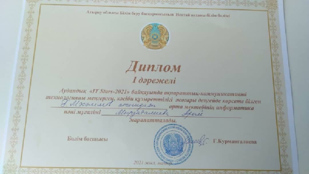 Аудандық " IT Stars-2021 байқауында ақпараттық-коммуникативтік технологияны меңгерген, кәсіби құзіреттілігін жоғары деңгейде көрсете білгені үшін "АТЫРАУ ОБЛЫСЫ БІЛІМ БЕРУ БАСҚАРМАСЫНЫҢ ИСАТАЙ АУДАНЫ БІЛІМ БӨЛІМІНІҢ "ЖАЛПЫ БІЛІМ БЕРЕТІН ҒИБАТОЛЛА МӘСӘЛІМОВ АТЫНДАҒЫ ОРТА МЕКТЕП" КОММУНАЛДЫҚ МЕМЛЕКЕТТІК МЕКЕМЕСІНІҢ информатика пәні мұғалімі Мырзағалиева Арай Темірбекқызы І дәрежелі дипломмен марапатталды. Әріптесімізді жеткен жетістігімен құттықтаймыз!