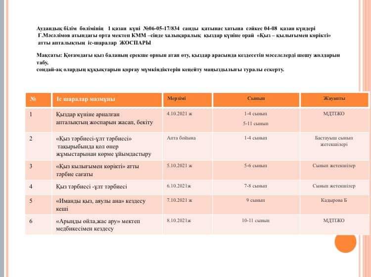 "Қыз - қызығымен көрікті" атты апталықтың іс-шаралар жоспары